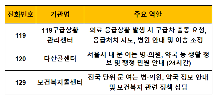 보건복지부가 운영하는 전국 단위 콜센터로, 서울뿐만 아니라 다른 지역의 비상진료기관 및 당번약국 정보도 안내받을 수 있다. 고향을 방문했거나 여행 중에 의료 정보가 필요할 때 유용하다.