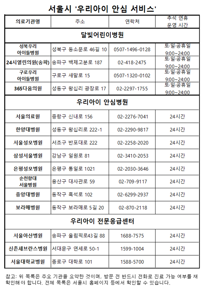 연휴 기간 가장 걱정되는 상황 중 하나는 면역력이 약한 아이들이 갑자기 아플 때다. 서울시는 증상의 경중에 따라 체계적으로 대응할 수 있는 단계별 소아 전문 진료 시스템인 '우리아이 안심 서비스'를 운영하고 있다.