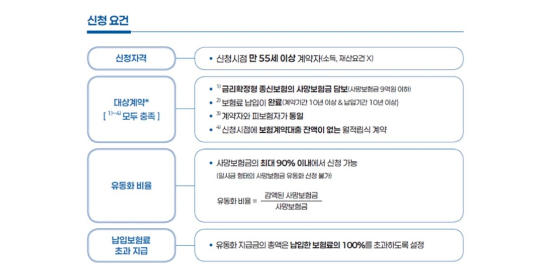 신청 자격은 ▲금리확정형 종신보험 ▲사망보험금 9억원 이하 ▲보험료 납입 완료(계약·납입기간 각 10년 이상) ▲계약자·피보험자 동일 ▲신청 시 보험계약대출 잔액 없음 등의 조건을 모두 충족해야 한다.